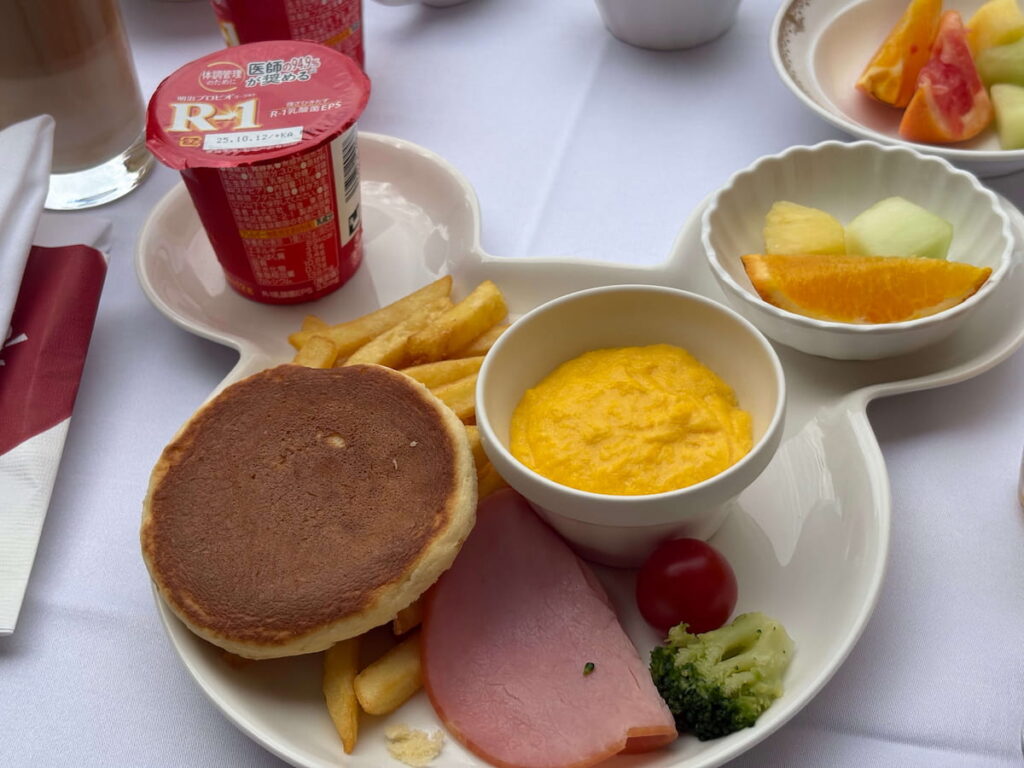 そのほか、ソーセージ・ベーコン・付け合わせ(ポテト/トマト/ブロッコリー)・サラダ・ヨーグルト・フルーツが付いてきます。