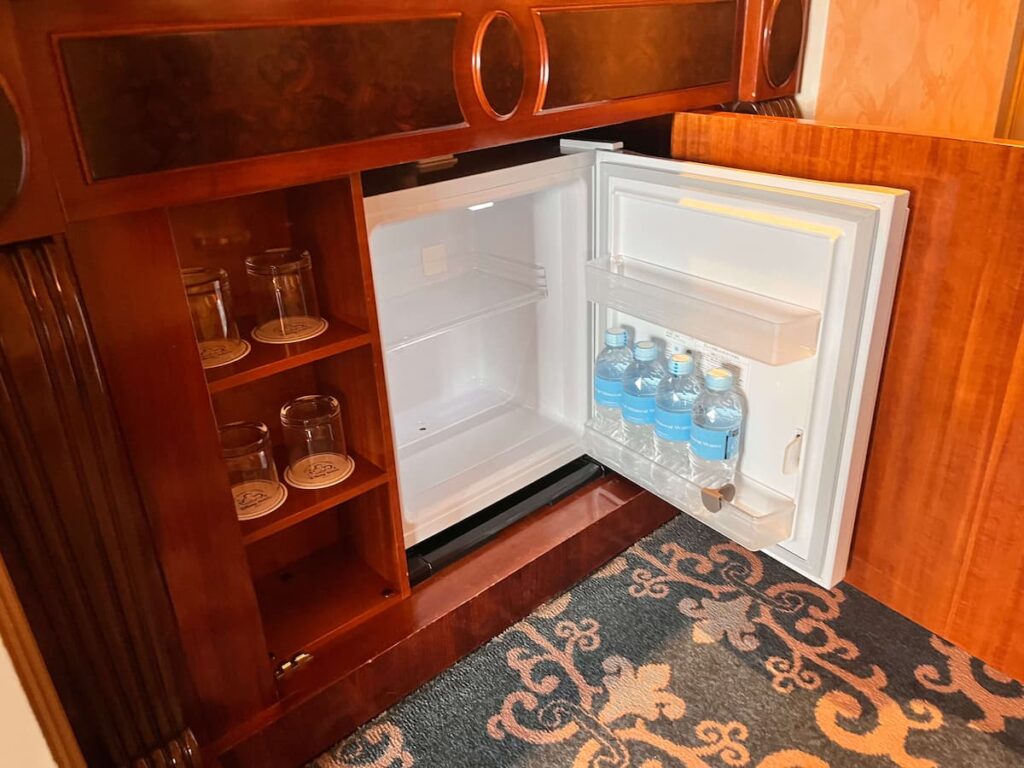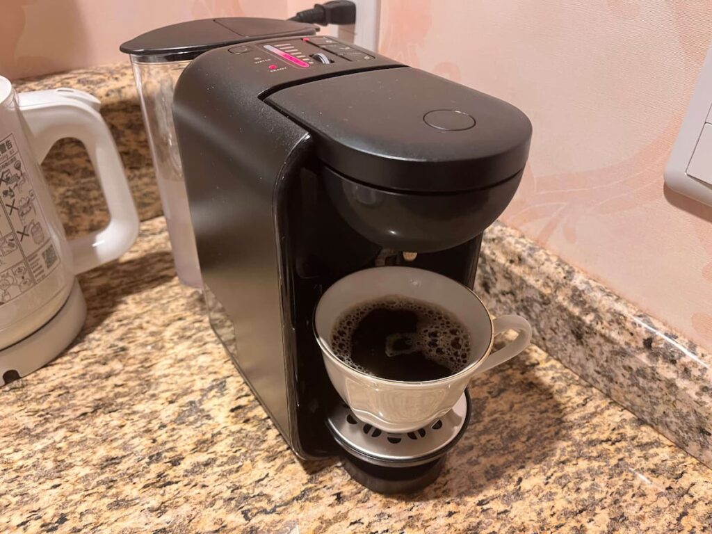 入り口すぐの棚には食器や冷蔵庫が収納されています。ハーバールームにはコーヒーメーカー常設されています。